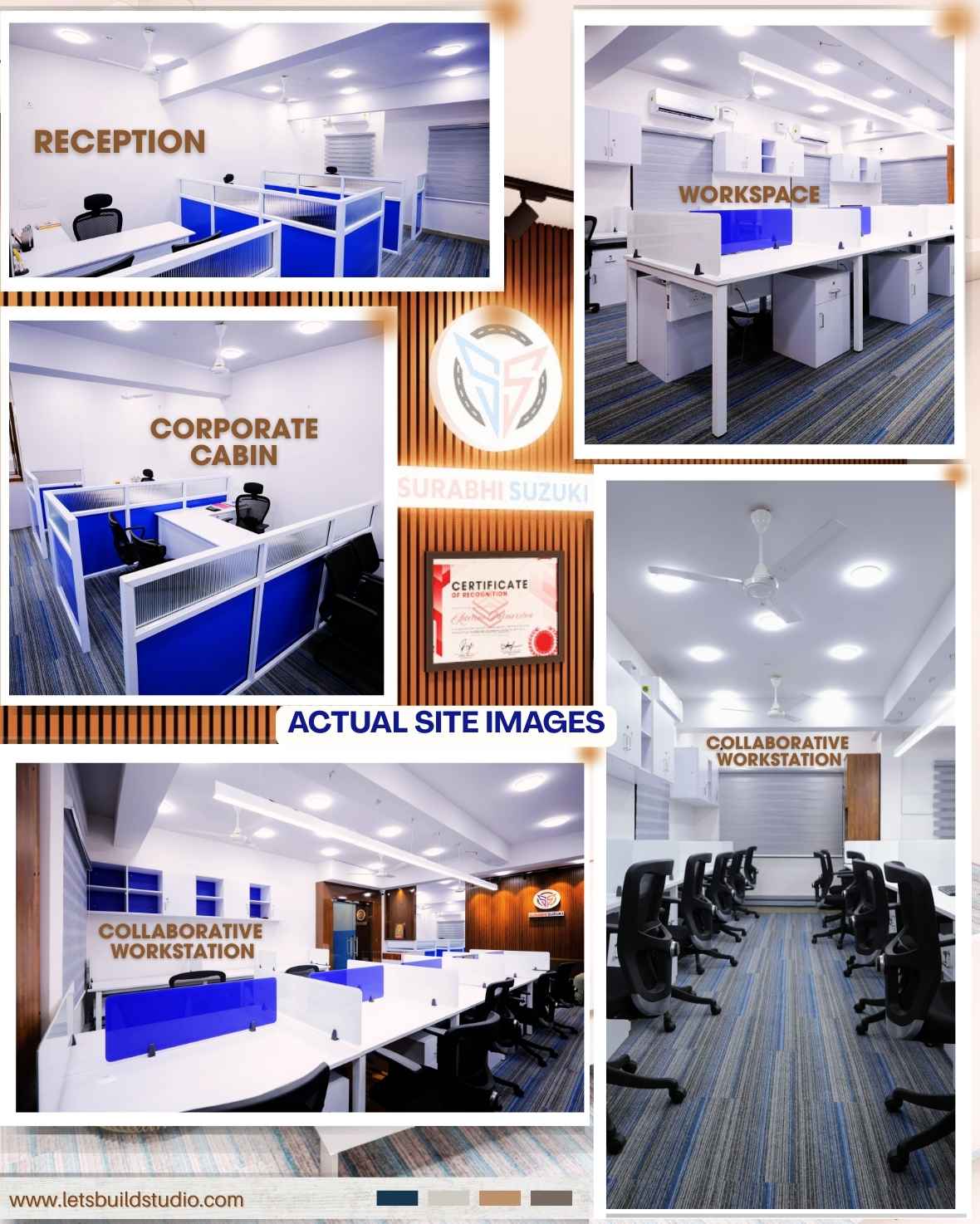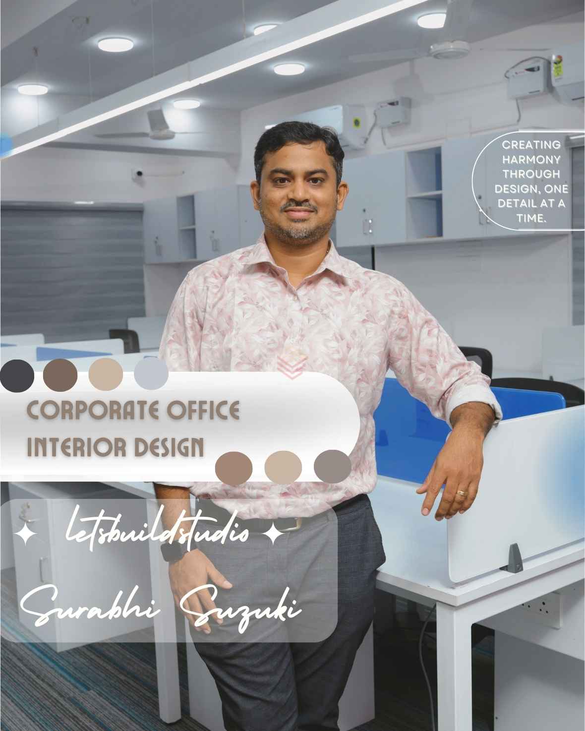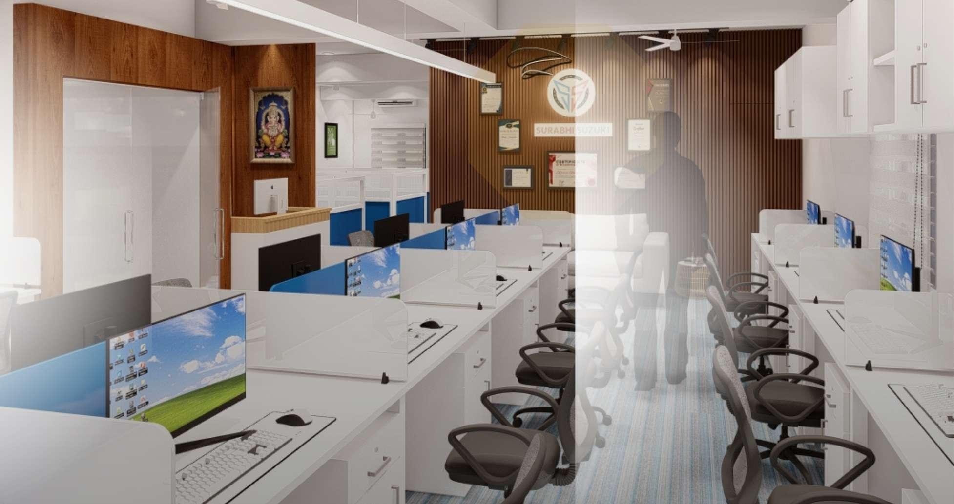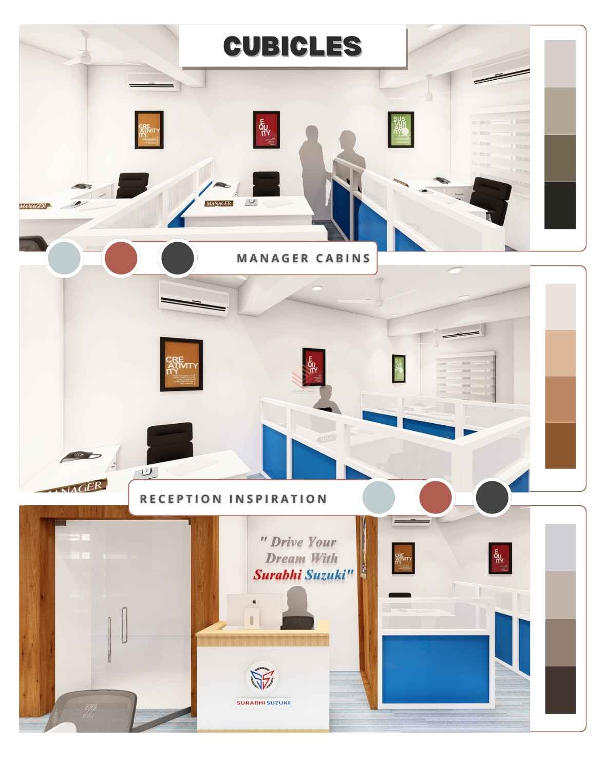 The corporate office interior design for Surabi Suzuki is a 1000 sq.ft workspace planned to optimize operational efficiency and spatial functionality. The layout organizes the office into clearly defined zones, including card-partitioned workstations, a conference room, and an open reception, to streamline workflow and circulation. The planning emphasizes clear spatial zoning, optimized circulation, and ergonomic work areas to ensure smooth daily workflow. Semi-open managerial cabins are designed to maintain privacy while allowing visual connectivity across teams. A dedicated conference room with a true-ceiling treatment supports focused discussions and meetings. Lighting is planned to provide uniform illumination and visual comfort throughout the workspace. Material selection combines subtle blue accents with warm wooden finishes to achieve a balanced corporate aesthetic. Our design approach in schematic design prioritizes clarity, usability, and long-term performance, ensuring precise execution and adherence to design intent. The project reflects a structured design process aligned with corporate workplace requirements.