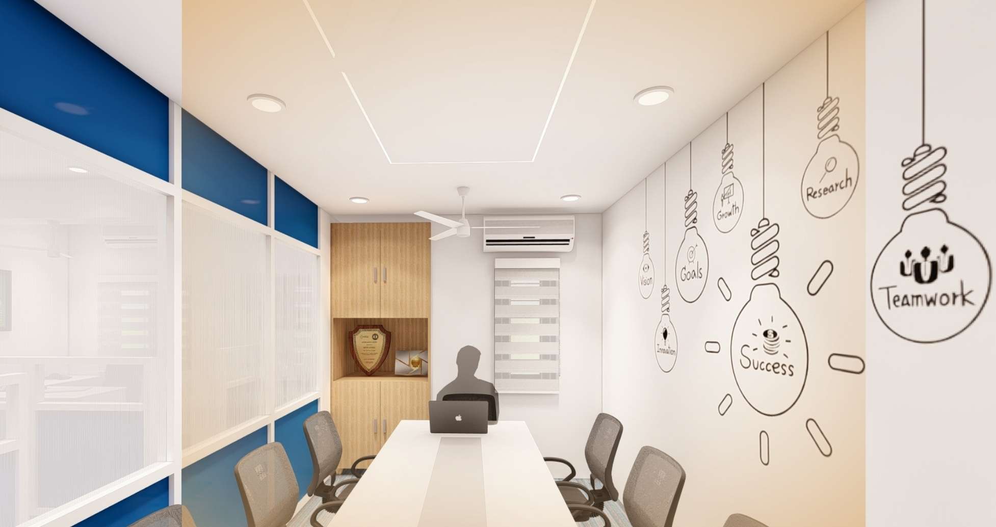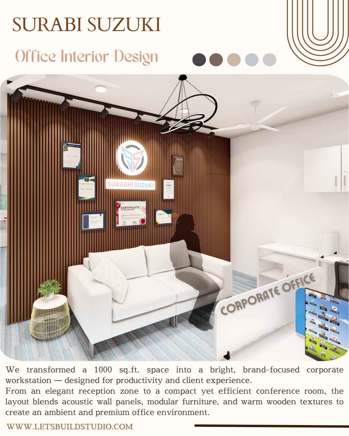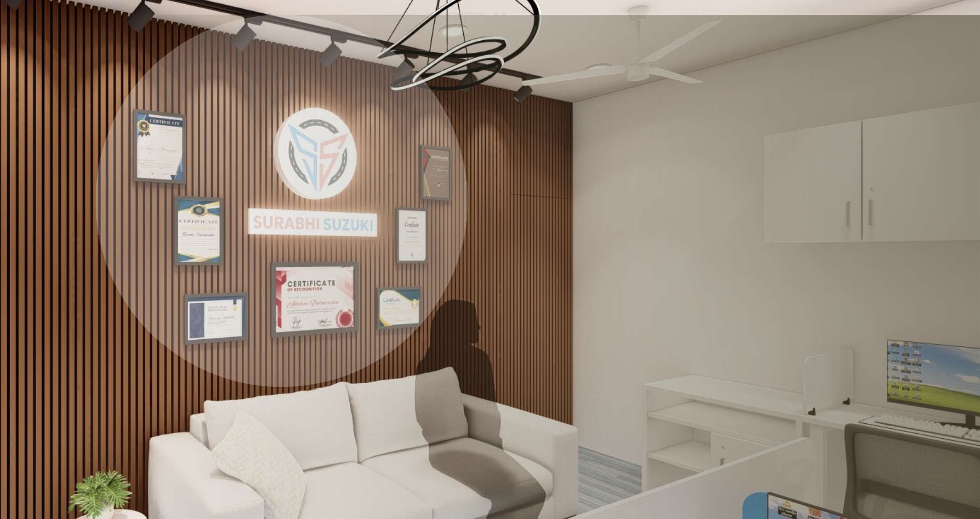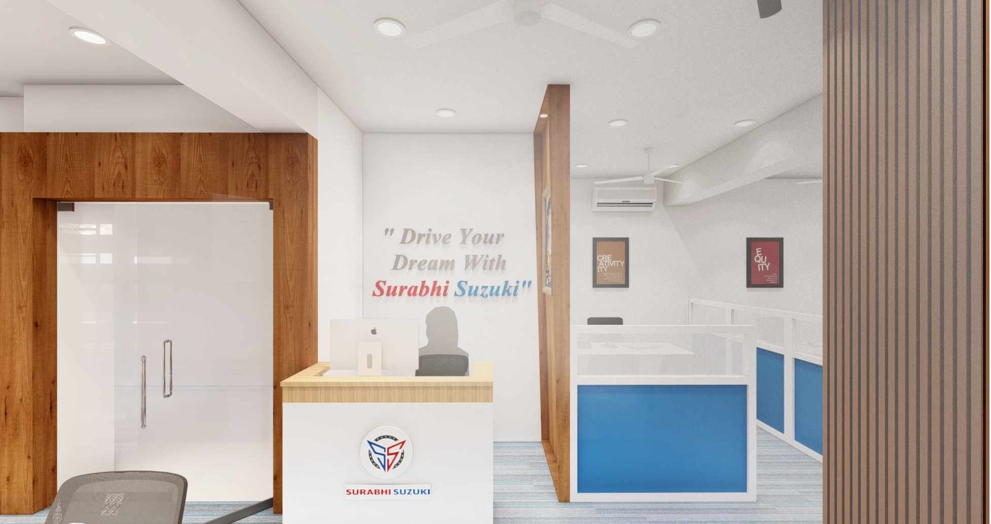 The corporate office interior design for Surabi Suzuki is a 1000 sq.ft workspace planned to optimize operational efficiency and spatial functionality. The layout organizes the office into clearly defined zones, including card-partitioned workstations, a conference room, and an open reception, to streamline workflow and circulation. The planning emphasizes clear spatial zoning, optimized circulation, and ergonomic work areas to ensure smooth daily workflow. Semi-open managerial cabins are designed to maintain privacy while allowing visual connectivity across teams. A dedicated conference room with a true-ceiling treatment supports focused discussions and meetings. Lighting is planned to provide uniform illumination and visual comfort throughout the workspace. Material selection combines subtle blue accents with warm wooden finishes to achieve a balanced corporate aesthetic. Our design approach in schematic design prioritizes clarity, usability, and long-term performance, ensuring precise execution and adherence to design intent. The project reflects a structured design process aligned with corporate workplace requirements.