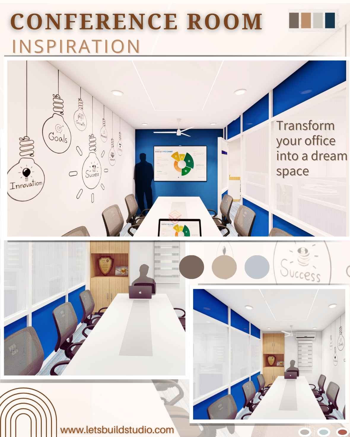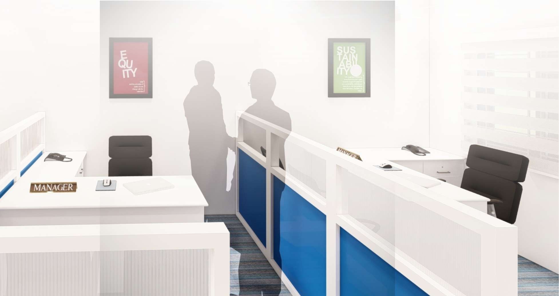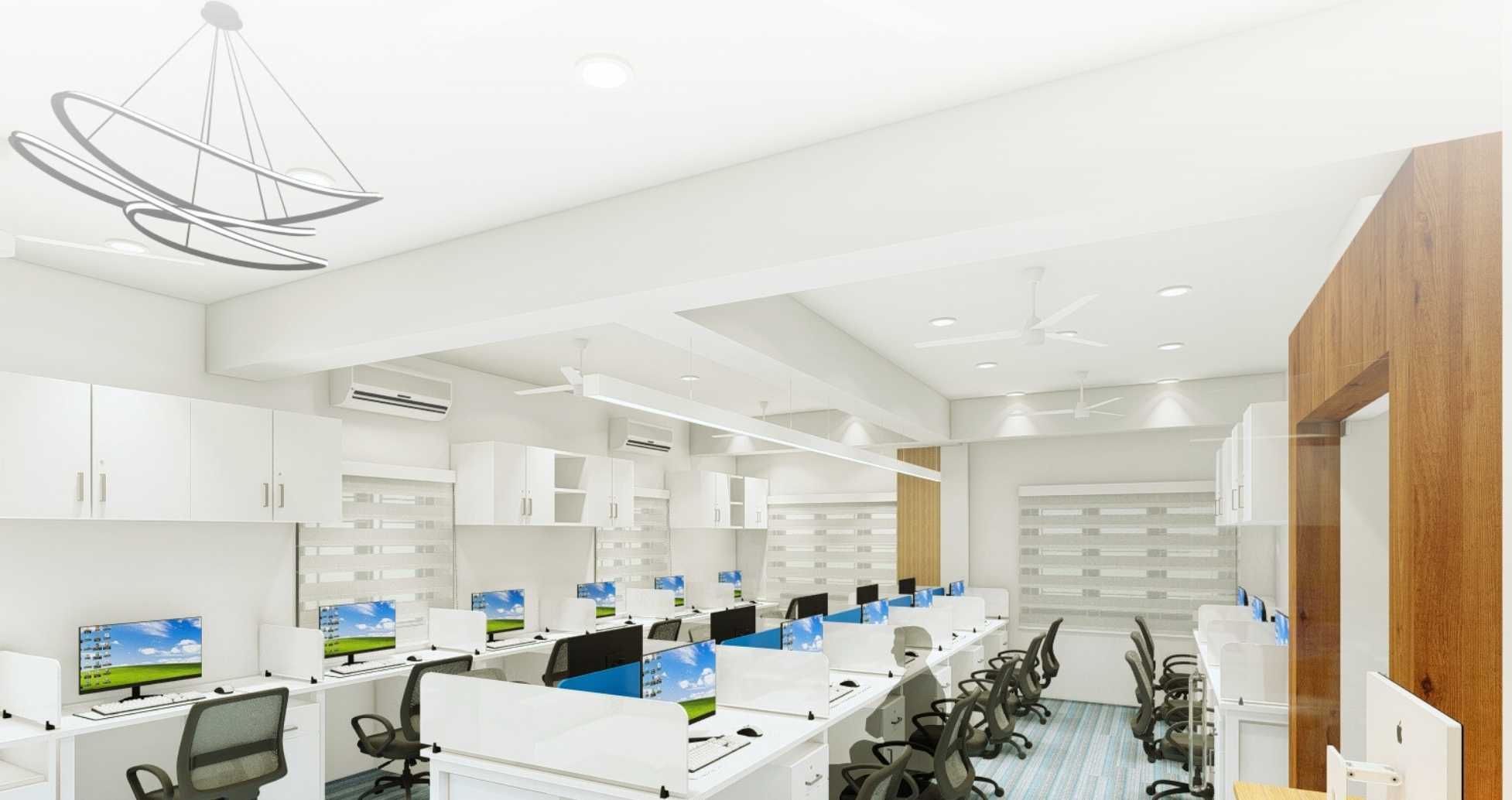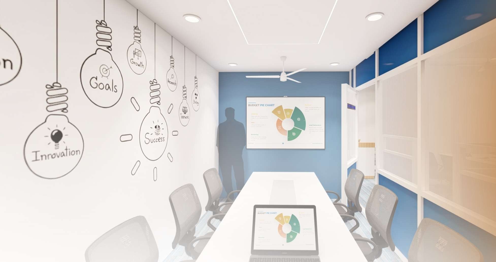 The corporate office interior design for Surabi Suzuki is a 1000 sq.ft workspace planned to optimize operational efficiency and spatial functionality. The layout organizes the office into clearly defined zones, including card-partitioned workstations, a conference room, and an open reception, to streamline workflow and circulation. The planning emphasizes clear spatial zoning, optimized circulation, and ergonomic work areas to ensure smooth daily workflow. Semi-open managerial cabins are designed to maintain privacy while allowing visual connectivity across teams. A dedicated conference room with a true-ceiling treatment supports focused discussions and meetings. Lighting is planned to provide uniform illumination and visual comfort throughout the workspace. Material selection combines subtle blue accents with warm wooden finishes to achieve a balanced corporate aesthetic. Our design approach in schematic design prioritizes clarity, usability, and long-term performance, ensuring precise execution and adherence to design intent. The project reflects a structured design process aligned with corporate workplace requirements.